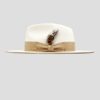 The Fedora is constructed of firm finish, fur felt and features a pinchfront crown, bound edge brim, interior cotton sweatband and grosgrain hat band with feather accent.