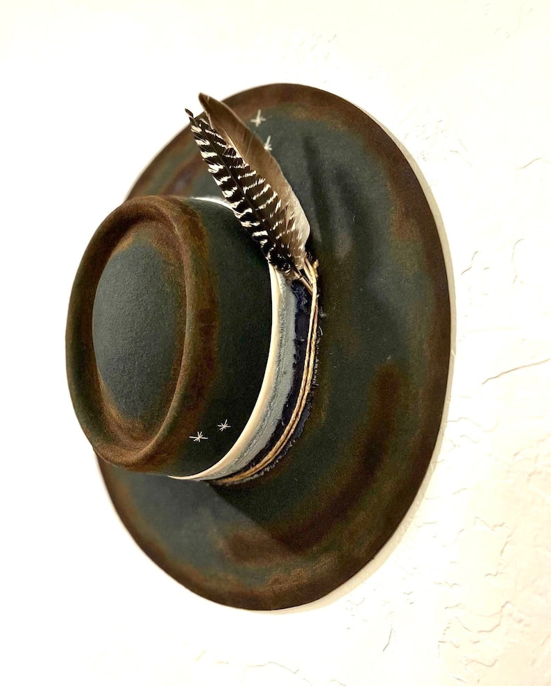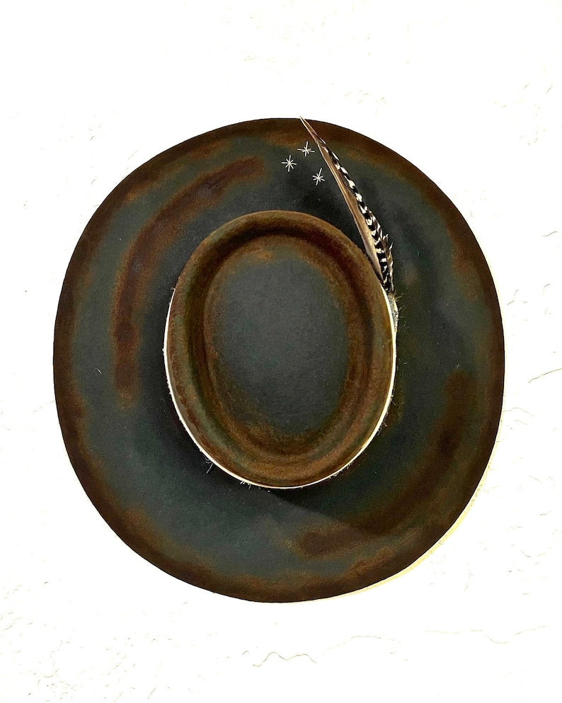 “Night Sky custom burned flat brim wool felt cowboy hat” is handcrafted, hand-dyed and hand-distressed. That means no two hats have the same color or character, making each hat truly one of a kind. Unique to each hat.