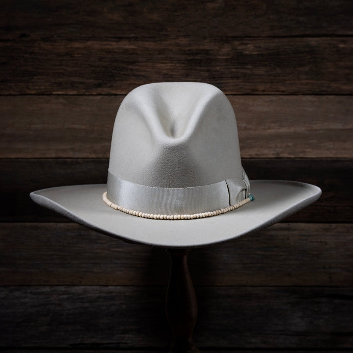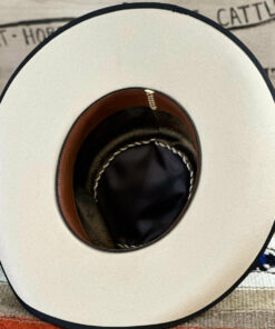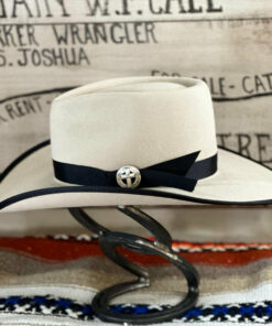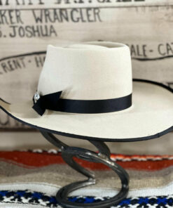 This light belly and it’s tan tones fit the bill with the black trim. The pinched front crown is 4.5″ in the back with a slight slope to 4″ in the front. The 4″ brim has a soft roll on the sides with a black bound edge. The 7/8″ grosgrain ribbon has an old fashioned look with a Cross concho to anchor it. Overall this hat is very unique with it’s look, band and style.